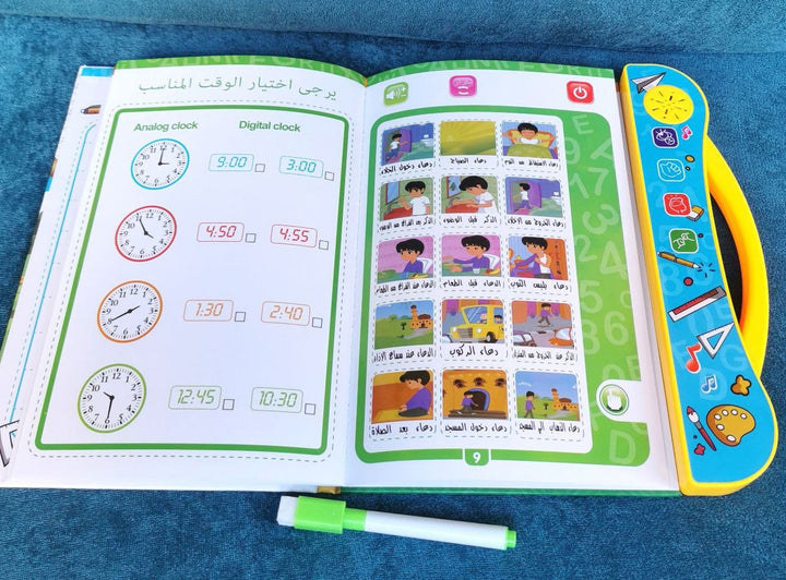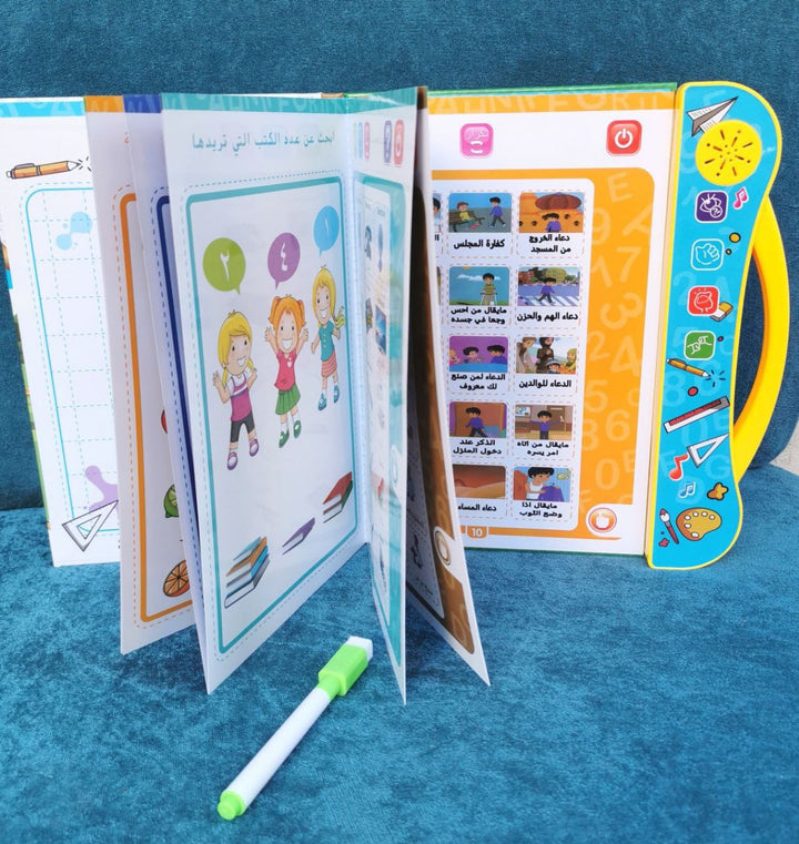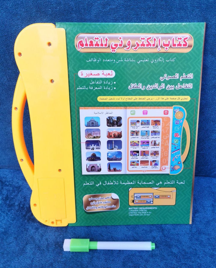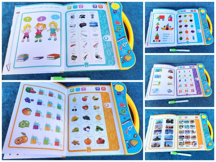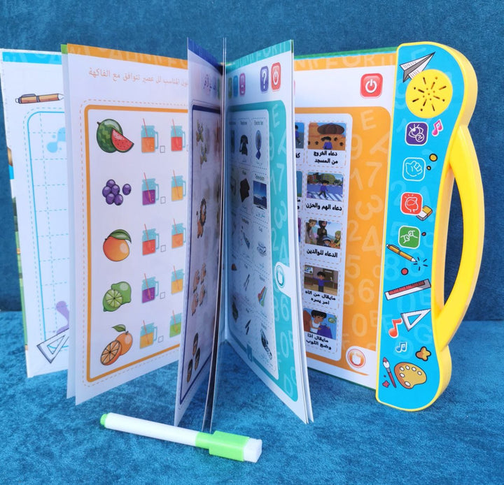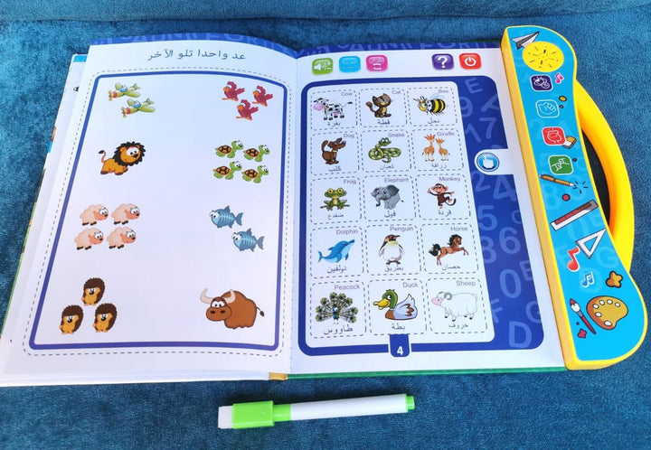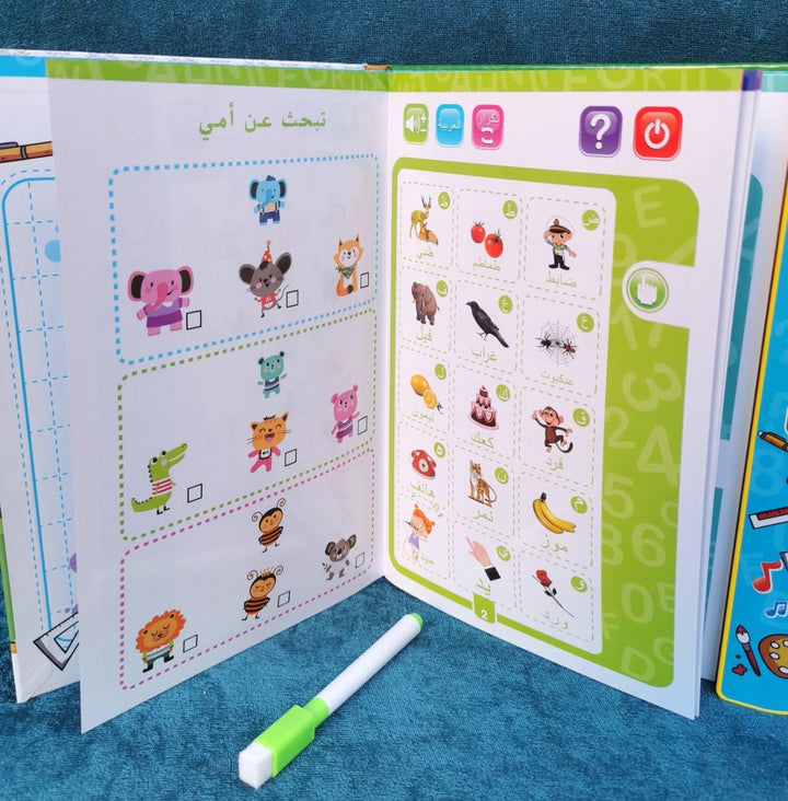أقوى كتاب إلكتروني تعليمي للأطفال يجمع بين المتعة والتعلم باستخدام الحواس. كتاب ثري بالمحتوى التربوي والعلمي بالعربية والإنجليزية، يحتوي على صفحات صوتية يعمل فيها الطفل بالنطق واللمس والسمع والنظر، مع أزرار للتكرار وللتبديل بين اللغتين. مزود بصفحات كرتون مقوى مزودة بأسئلة متنوعة يمكن حلها بقلم قابل للمسح ليعيد الطفل الحل مئات المرات.