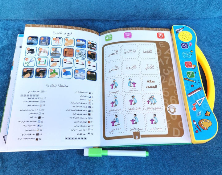 يتضمن الكتاب تعليم الأدعية اليومية، بعض سور القرآن، تعليم الوقت، أسماء الحيوانات والفواكه والأشياء، الأرقام، الألوان، الأشكال الهندسية، الرسم، الوضوء، الحج والعمرة، بالإضافة إلى أسئلة متنوعة لاختبار الطفل. وسيلة مثالية لتنمية الإدراك، تعزيز مهارات التعلم، وتشجيع الطفل على التعلم بشكل ممتع وتفاعلي.